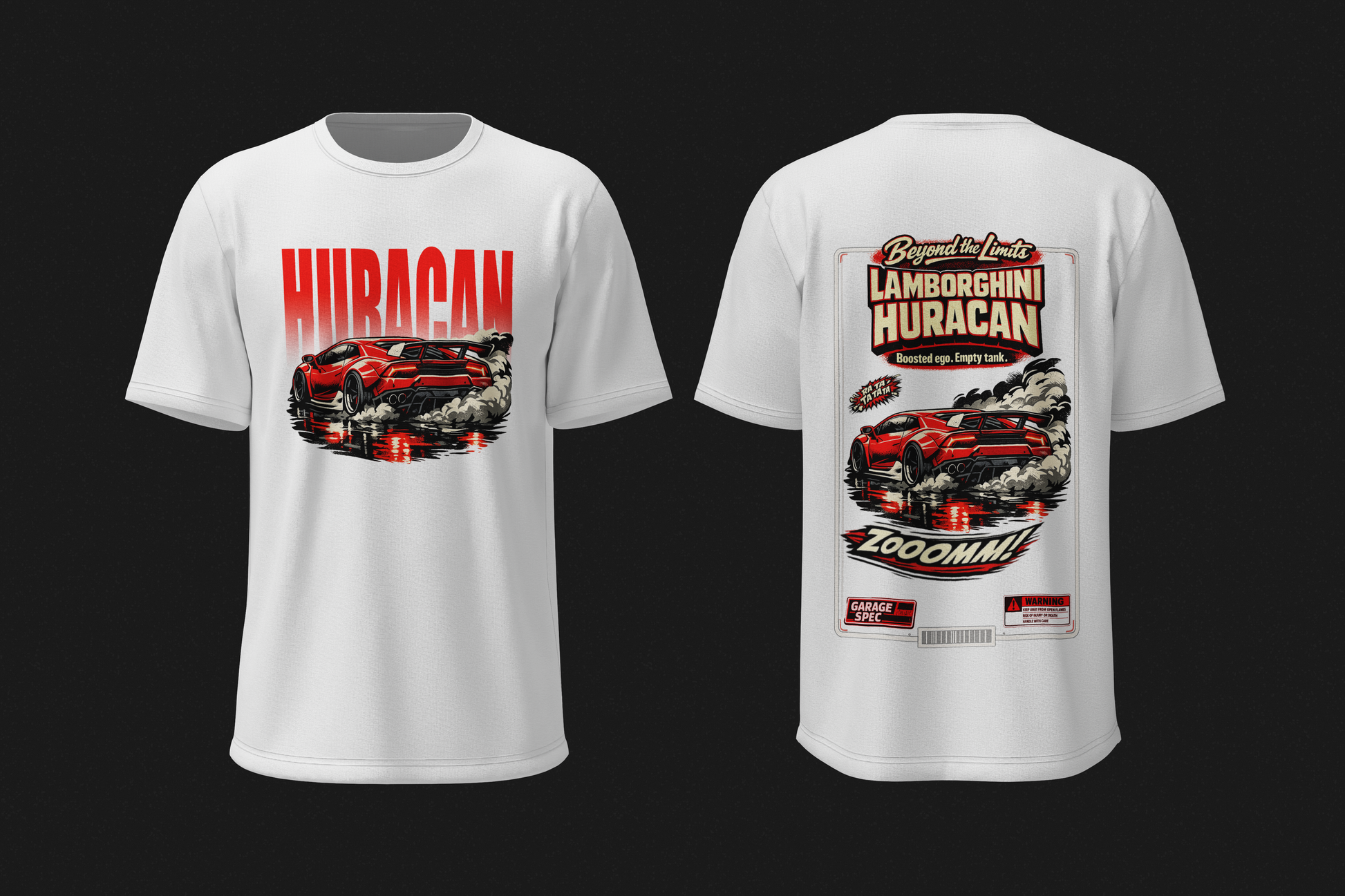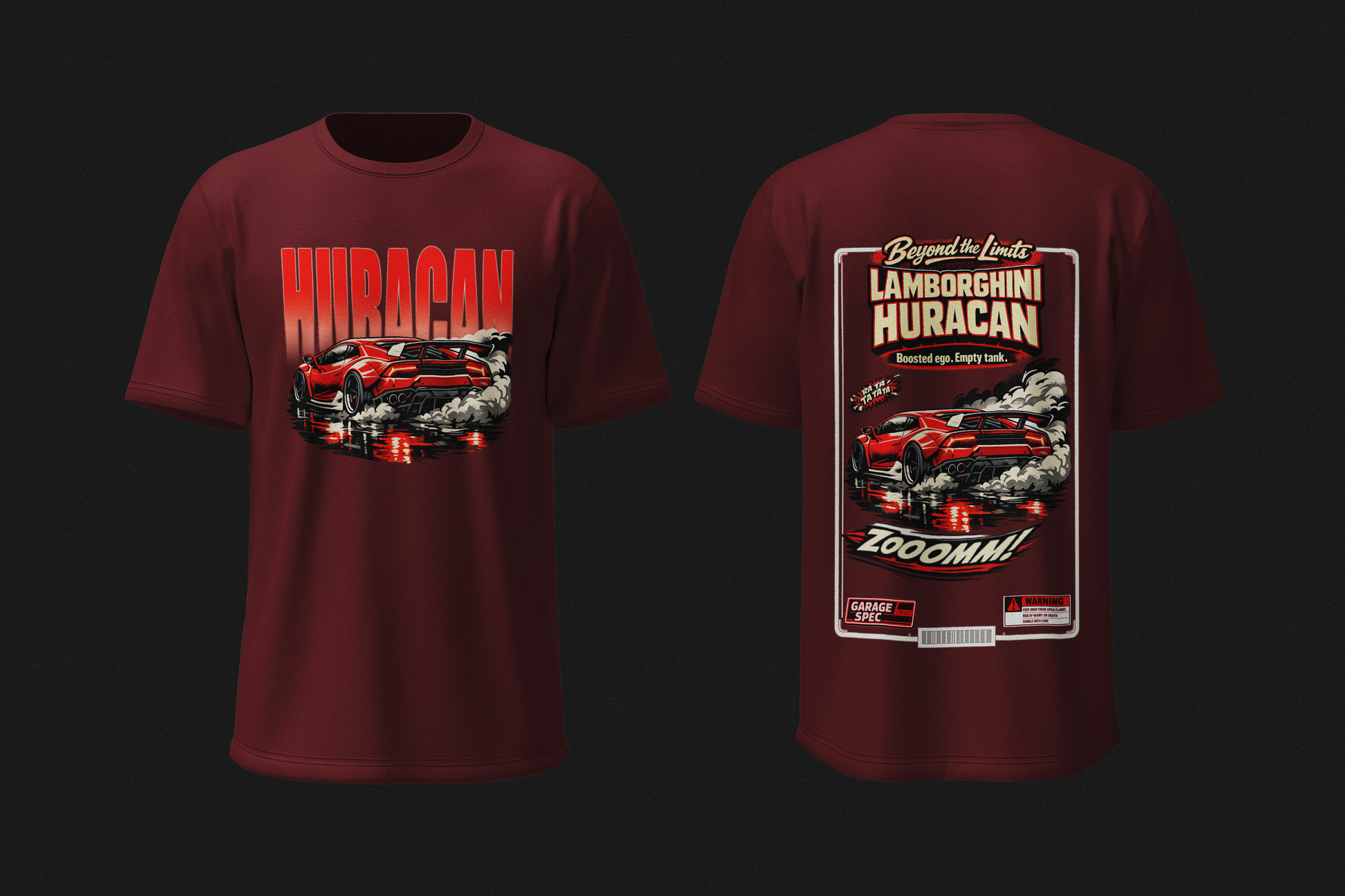 The Lamborghini Huracán “Beyond Limits” Tee is Garage Drop 007 — built for people who don’t lift, they launch. Low, loud, and violently fast, this piece captures pure Italian chaos. The front keeps it clean with a bold HURACÁN hit, while the back unleashes the madness: a red Huracán tearing through smoke and wet asphalt reflections with a ZOOOMMM that hits before the car even leaves your sight.